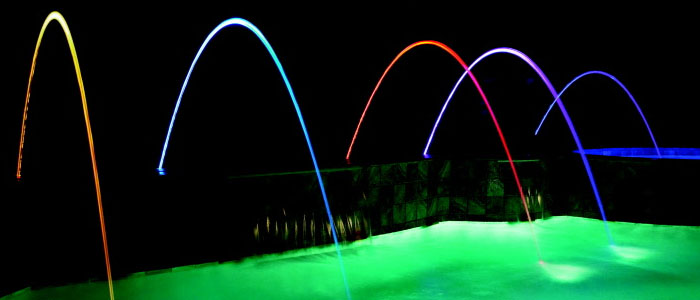 Lightbender Laminar create totally clear, uniform arcs of moving water that originate from either your pool deck or surrounding landscape. At night, these translucent streams are brilliantly colored with an LED light source. The result is a water effect that adds an elegant bit of entertainment to your poolscape.
